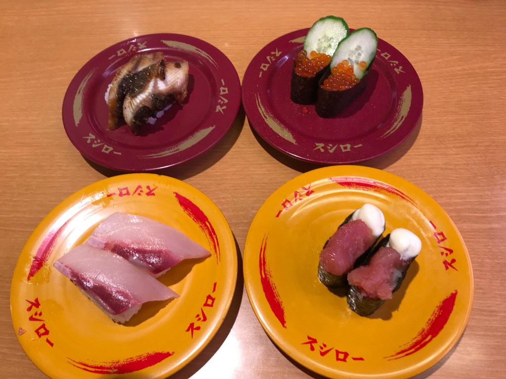 Most locations sell sushi via different plate colors or sizes, with the most basic sushi costing $1 US Dollars per plate. They have many sushi varieties, and you can get the tea and water for free. But be careful. You can easily lose track of how many plates you get, and you could end-up spending more than you wanted to. But hey, your stomach will be happy.
