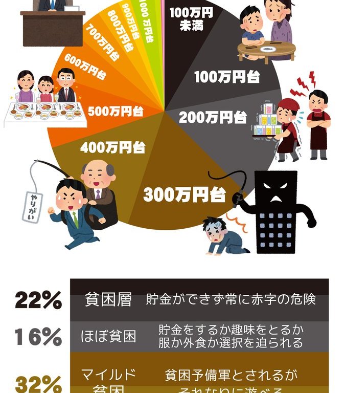 You don’t have to know Japanese to understand that the chart indicates that many people in Japan are not making very much money. In fact, the numbers show that 22% of people in Japan are considered very poor, another 16% are simply poor, and 32% are almost poor. However, it seems that most people in Japan have learned to live with these levels of income by using strict budgets.